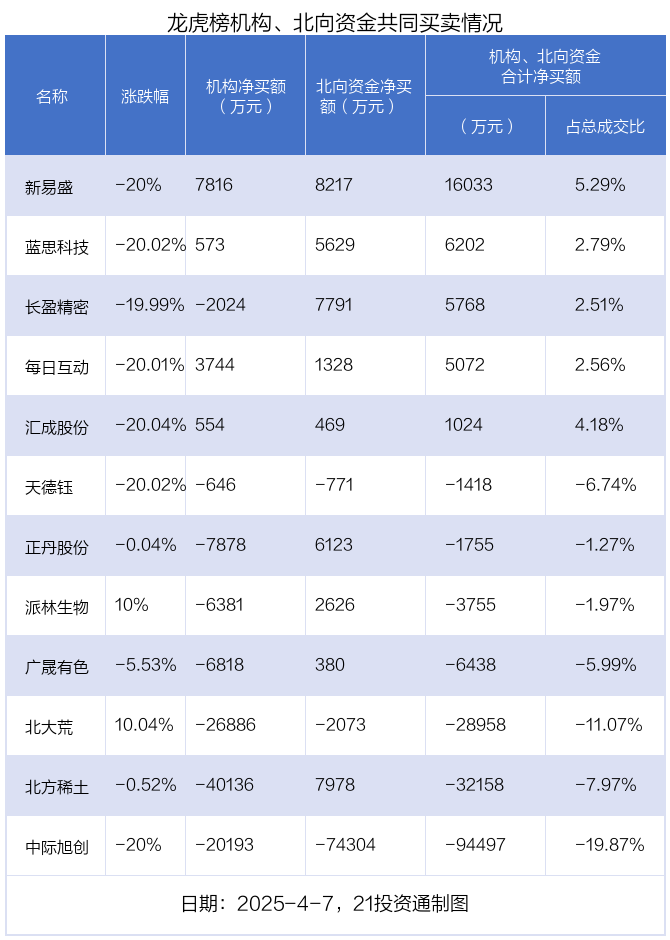 值得注意的是,机构和北向资金共同净买入了新易盛、蓝思科技、每日互动、汇成股份等4股;共同净卖出了天德钰、北大荒、中际旭创等3股;在北方稀土,长盈精密,正丹股份,派林生物,广晟有色上出现分歧,机构净卖出北方稀土4.01亿元,北向资金净买入7978.47万元;机构净卖出长盈精密2023.55万元,北向资金净买入7791.38万元;机构净卖出正丹股份7878.28万元,北向资金净买入6122.81万元;机构净卖出派林生物6380.92万元,北向资金净买入2626.14万元;机构净卖出广晟有色6817.96万元,北向资金净买入380万元。