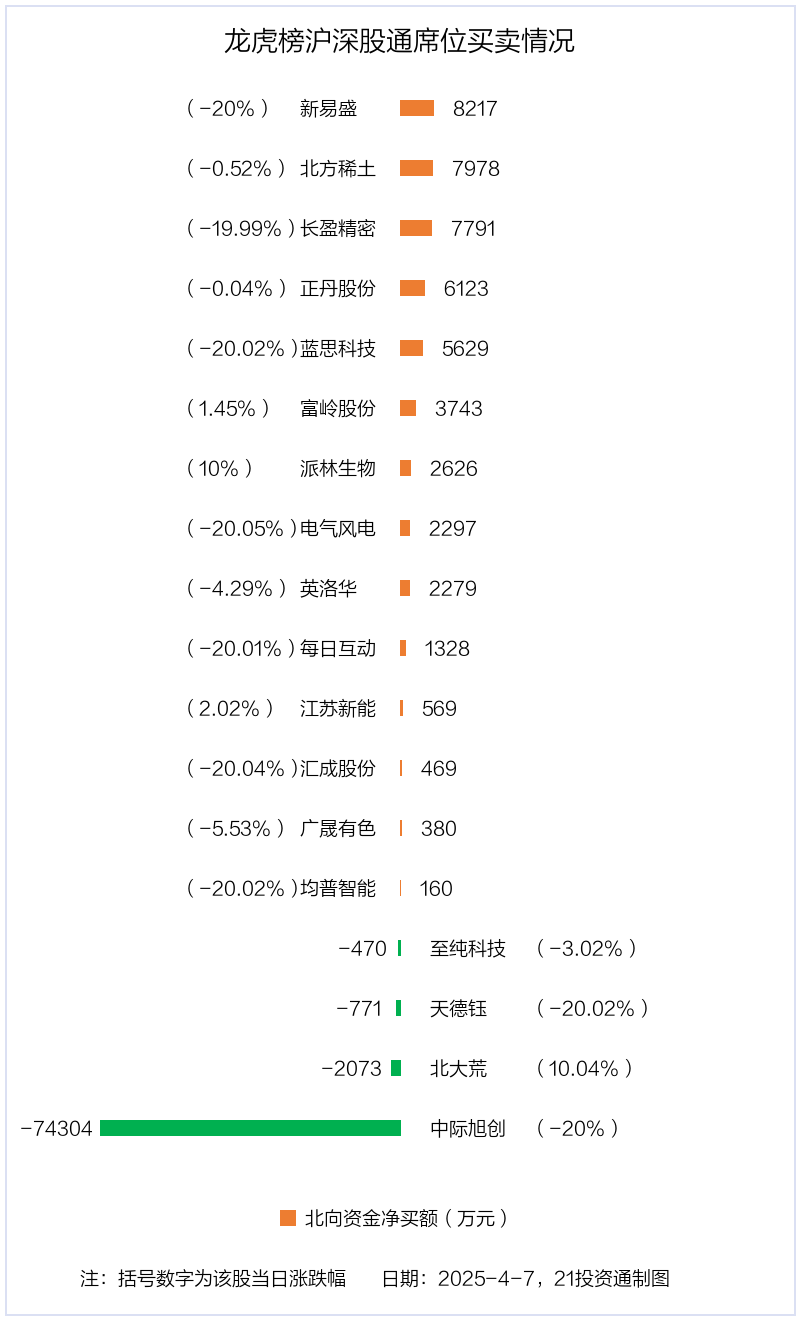 4月7日,北向资金参与龙虎榜中的个股共有18只,合计净卖出2.8亿元。其中沪股通净买入6 股,净卖出3 股,合计净买入8538.76万元;深股通净买入8 股,净卖出1 股,合计净卖出3.66亿元。