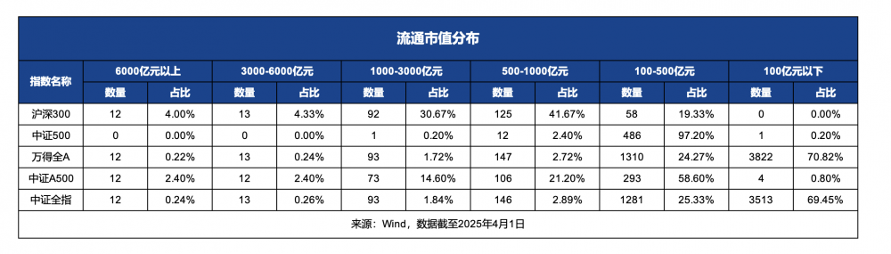 在市值分布上,中证A500指数成分股的结构更优,兼顾龙头稳定性与成长潜力。据Wind数据统计,截至4月1日,中证A500指数成分股平均市值约为1100亿元,与沪深300同属“千亿阵营”,但覆盖范围更广:既有不少万亿市值的行业巨头,也包含几十亿元细分领域的“隐形冠军”。