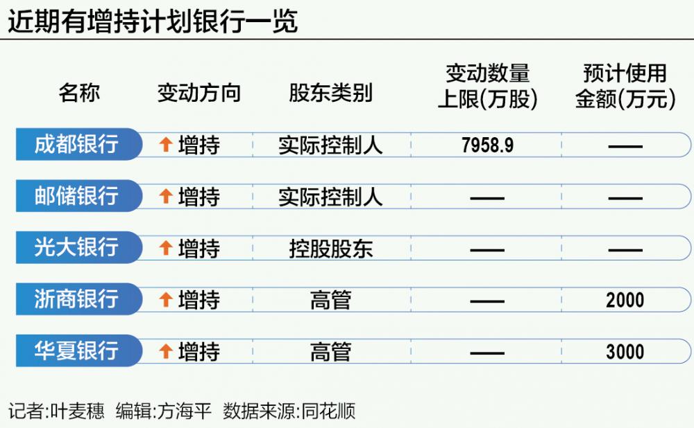 近期,市场形势多变,A股也出现较大的波动,为了传递股东对公司的信心,以及对资本市场长期投资价值的认可,包括华夏银行、邮储银行、光大银行、浙商银行、成都银行等多家银行陆续发布大股东增持公告,其中,浙商银行为高管个人增持。