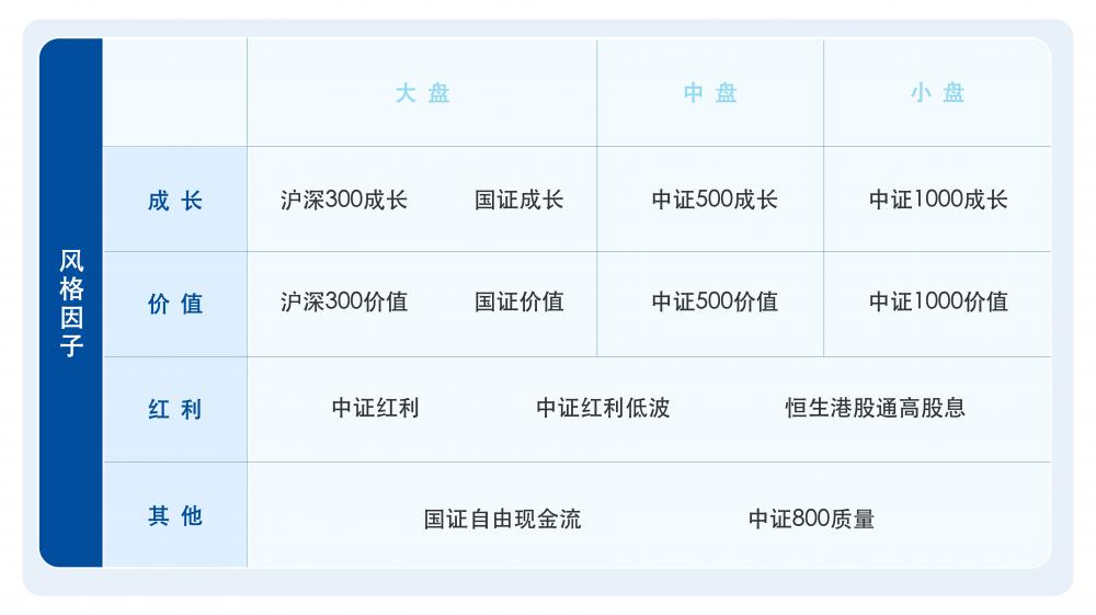 理清风格因子概念与分类后,对于这类不太熟悉的产品,投资者也可以迅速了解其所属类型,例如沪深300成长是大盘成长,中证1000价值是小盘价值,两者风险收益特征完全不同,投资者可以结合自己的需求匹配相应的产品。