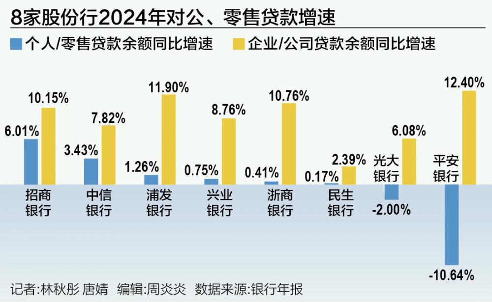21世纪经济报道记者梳理8家上市股份行的年报发现,2024年股份行对公贷款的扩张速度远高于个人及零售贷款。8家股份行中,有7家对公贷款的同比增速超过了5%,其中有4家超过了10%。对公贷款扩张速度最快的是平安银行,为12.4%,其余依次为浦发银行(11.90%)、浙商银行(10.76%)、招商银行(10.15%)、兴业银行(8.76%)、中信银行(7.82%)、光大银行(6.08%)和民生银行(2.39%)。