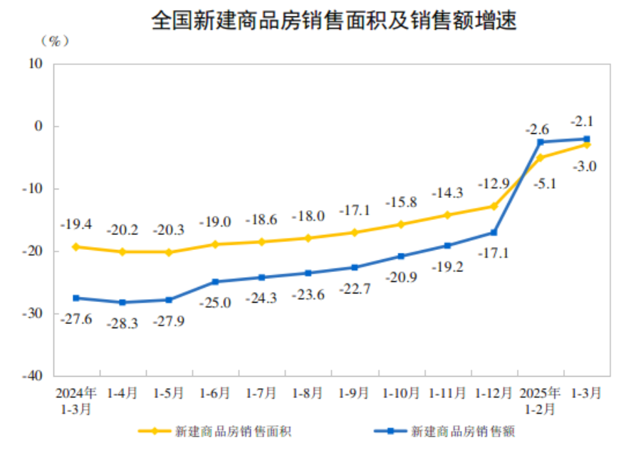 纵观一季度,市场销售有所回暖。据国家统计局数据,一季度全国新建商品房销售面积同比下降3%,降幅比去年全年收窄9.9个百分点,比1-2月收窄2.1个百分点;全国新建商品房销售额同比下降2.1%,降幅比去年全年收窄15个百分点,比1-2月收窄0.5个百分点。
