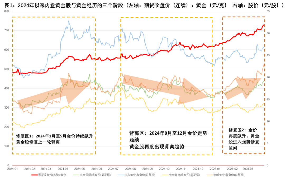 2024年以来内盘黄金股与黄金经历了修复➡背离➡修复三个阶段。第一次修复阶段发生在2024.1-2024.5,在经历了一段时间盘整后,于2024.8-2024.12开启背离,而后于2025.1月至今开启第二次修复阶段。天风研究持续更新【资源为王·黄金深度研究专题】,天风金属与材料刘奕町团队通过对这三次转折的复盘,总结驱动黄金商品与权益背离与修复的驱动,为后续权益相对商品可能的走势提供指引。