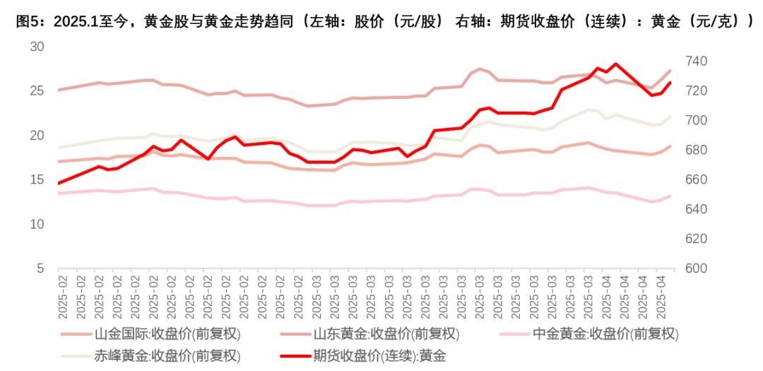 分子端:金价有望继续走高,抬升企业EPS。在美国滞胀预期不断增强之外,美国对全球大幅加征关税的做法增加了市场对全球货币体系崩乱的担忧,黄金作为保值资产其重要性呼之欲出,金价具备充沛上行动力,黄金股利润释放亦有望更加顺畅。