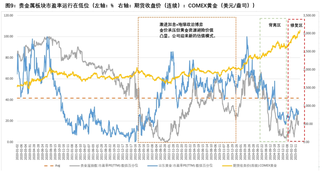 背离区2024.8-2024.12:24年8月底降息预期落地,市场担忧后续金价动能与金企业绩稳定性