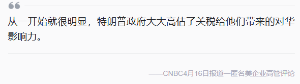 “白宫说,中国人没有来电。”这是白宫告知这名美企业高管的最新中美沟通情况。由此,这名高管发出了本文开头的感慨,即——特朗普政府大大高估了关税给他们带来的对华影响力。