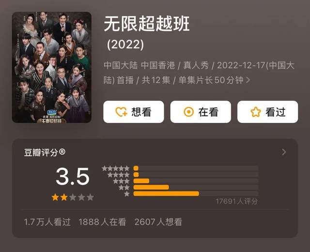 或许是出于对市场情绪的考量,演技综艺顺势停了一阵子。21年后的两年里,只有《无限超越班》试水了一季。它成了演技类综艺的评价最低谷,豆瓣评分仅3.5分。