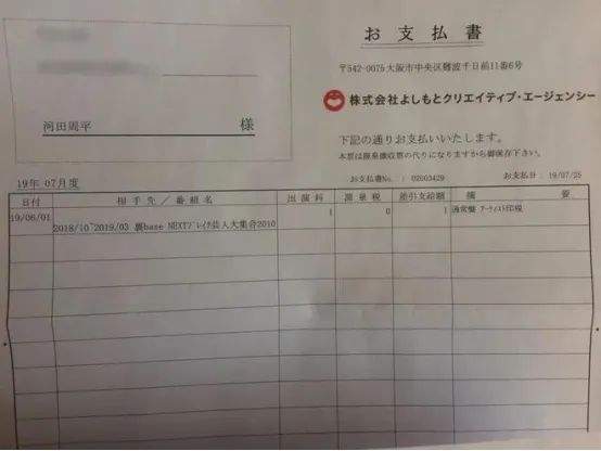 打通演艺公司、电视台、广告商这条产业线的吉本工业,公司和艺人的收益分成比高达9:1。搞笑艺人河田周平曝光的工资单里显示,他参加一场演出只能拿到1日元(约合人民币5分钱)。