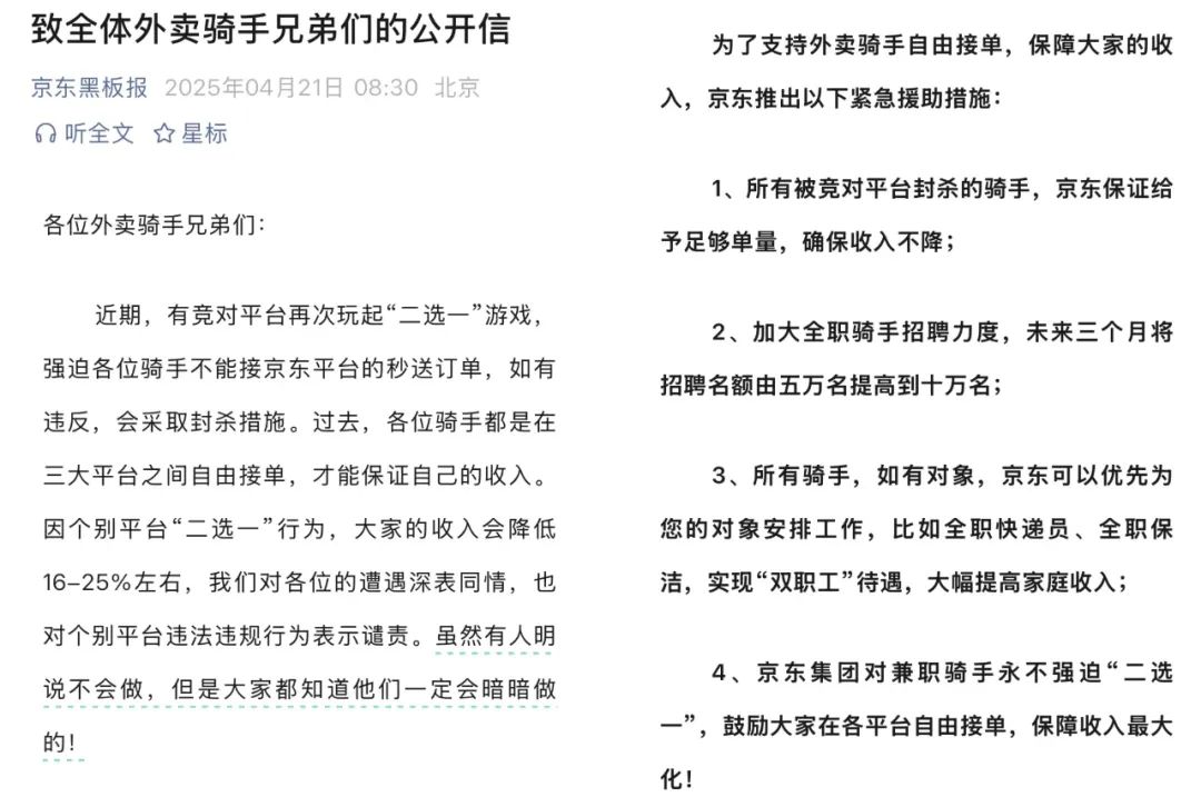 4月21日,京东发布一封公开信,称针对个别平台要求骑手“二选一”的行为,将推出多项举措。
