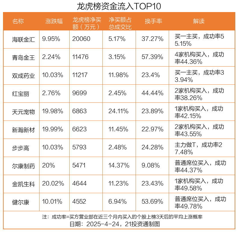 4月24日,上证指数上涨0.03%,深证成指下跌0.58%,创业板指下跌0.68%。盘后龙虎榜数据显示,共有56只个股因当日异动登上龙虎榜,资金净流入最多的是海联金汇(002537.SZ),达2.01亿元。