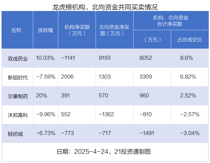 值得注意的是,机构和北向资金共同净买入了新铝时代、尔康制药等2股;共同净卖出了轻纺城;在双成药业,沐邦高科上出现分歧,机构净卖出双成药业1141.06万元,北向资金净买入9193万元;机构净买入沐邦高科552.1万元,北向资金净卖出1362.17万元。