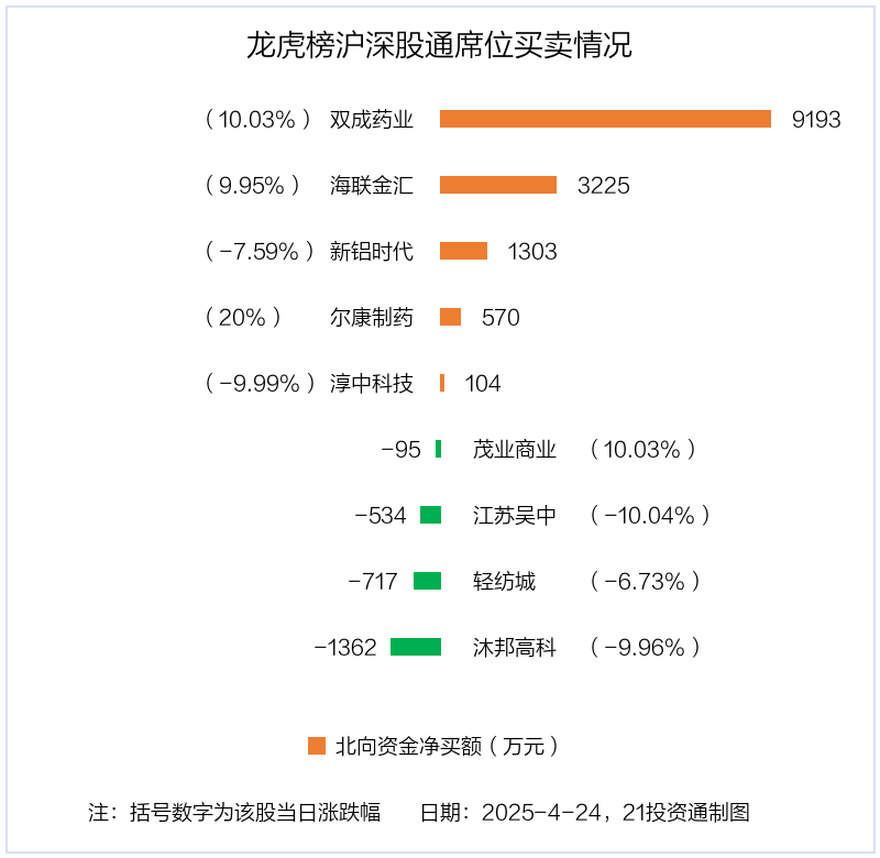 4月24日,北向资金参与龙虎榜中的个股共有9只,合计净买入1.17亿元。其中沪股通净买入1 股,净卖出4 股,合计净卖出2604.43万元;深股通净买入4 股,合计净买入1.43亿元。