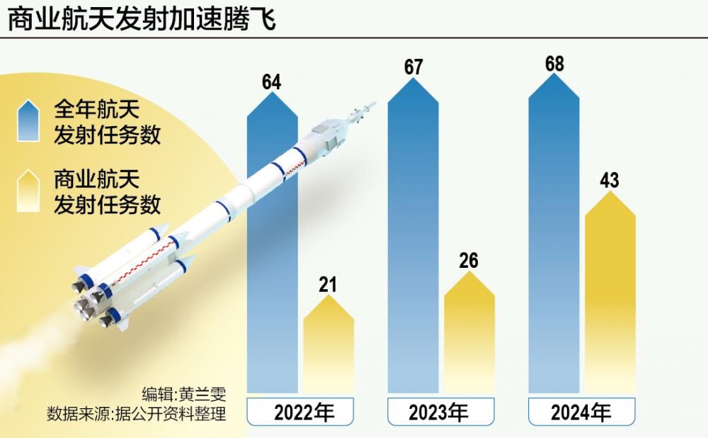 2024年我国共完成68次航天发射任务,创历史新高。其中商业航天发射共43次,民营火箭公司发射次数12次,占比18%。