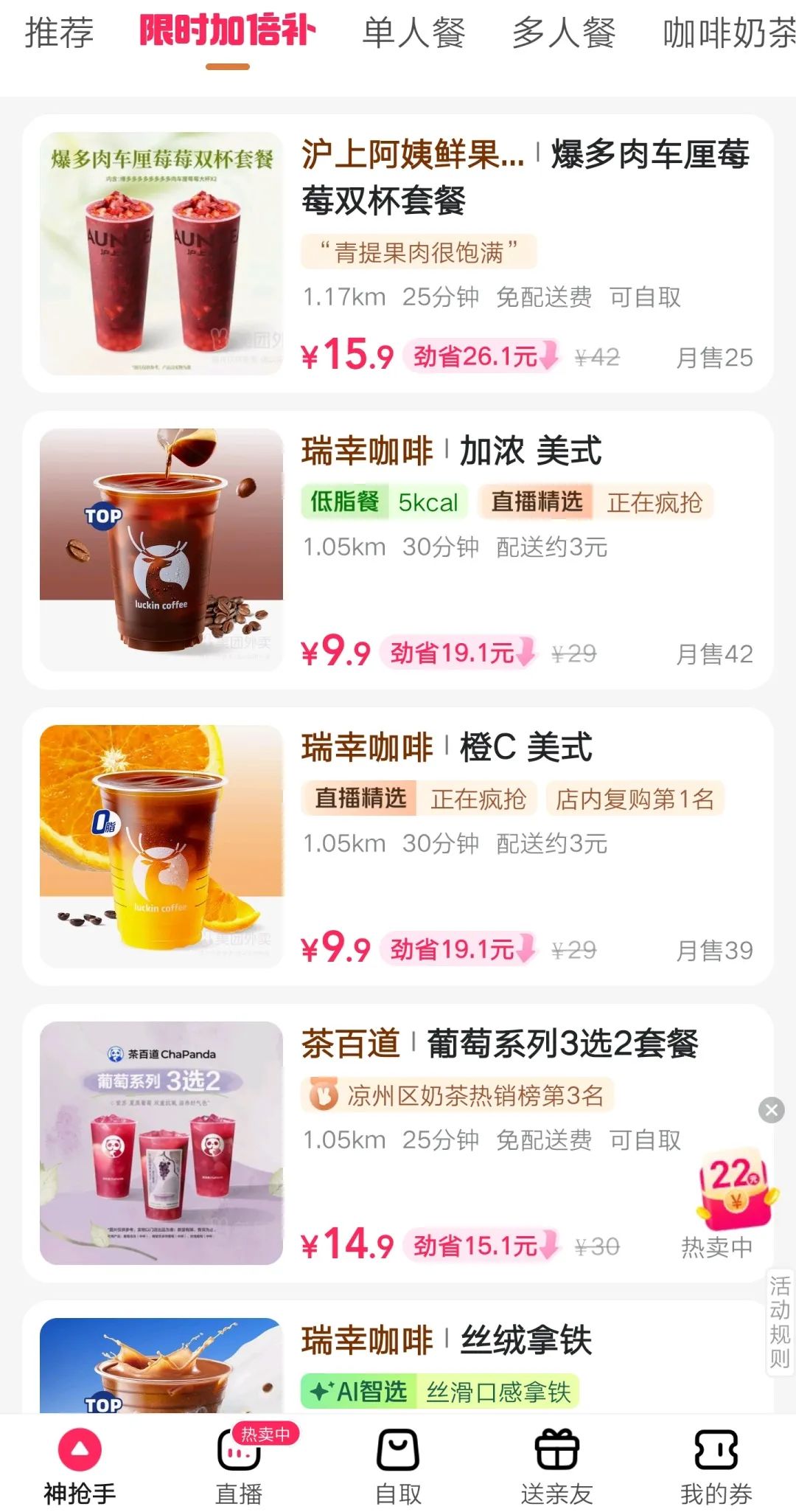 有本地生活服务商从系统看到的数据显示,前几天通过美团「神抢手」补贴,一点点、奈雪、蜜雪冰城、星巴克等都有几百万单销量。也有用户发现,9块9的瑞幸、18块5的星巴克同时出现在「限时加倍补」活动当中,充当引流品。