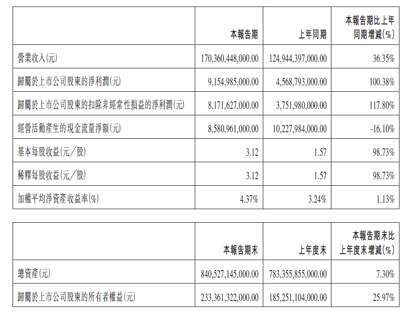 一季报显示,比亚迪实现营收1703.60亿元,同比增36.35%;归母净利润91.55亿元,同比增100.38%。业绩高增长得益于全球销量持续飙升。今年一季度,比亚迪销量达到创纪录的100.08万辆,同比增长60%。其中,比亚迪乘用车和皮卡海外市场销量超20万辆,同比增长110%。