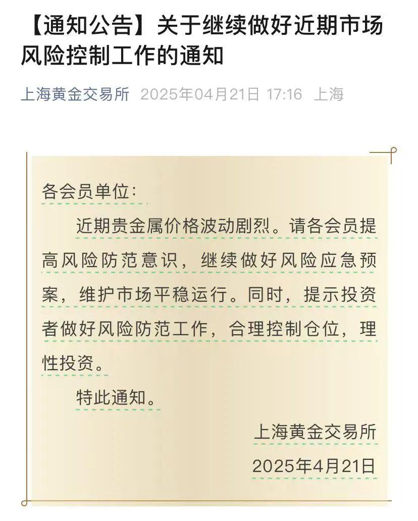 4月21日,上海黄金交易所发布《关于继续做好近期市场风险控制工作的通知》,提示投资者做好风险防范工作,合理控制仓位,理性投资。