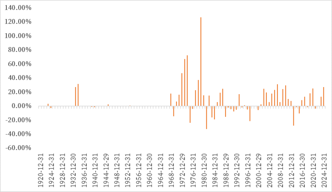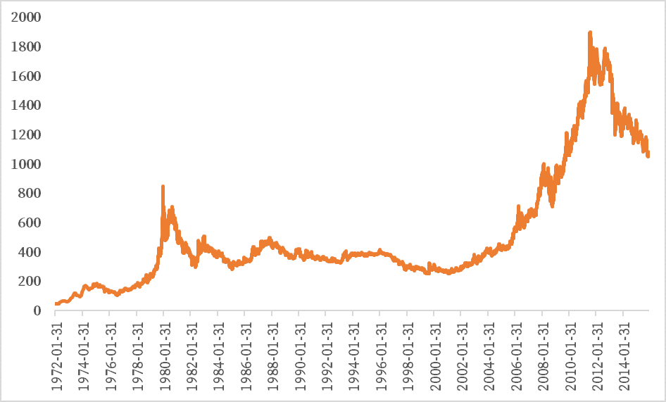 从历史上看,金价上涨可以从1971年布雷顿森林体系解体后算起,之前的年份除1933年、1934年大涨外,基本都波澜不惊。