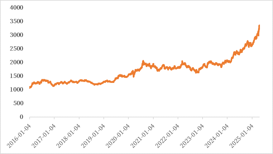 从2016年1月至今,黄金的涨幅已达2.16倍,在3400美元/盎司附近,上涨时间为9年零3个月。