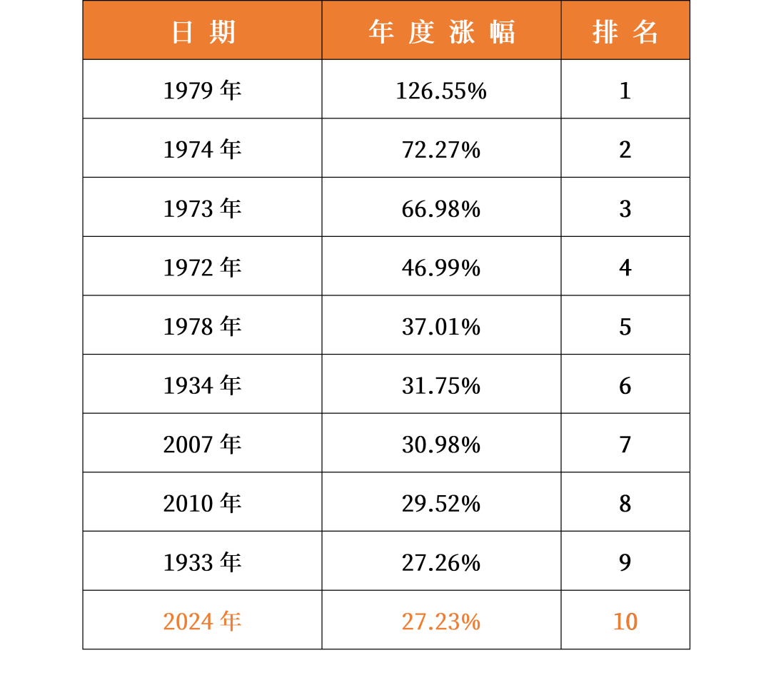 Wind数据显示,2024年伦敦金现全年大涨27%,创2011年以来年度最大涨幅,也是1920年以来历史前十大年度涨幅。