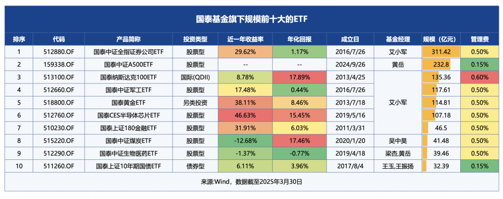 目前国泰基金旗下规模前三大的ETF是证券ETF、中证A500ETF、纳指ETF,规模分别为311亿元、233亿元、136亿元。
