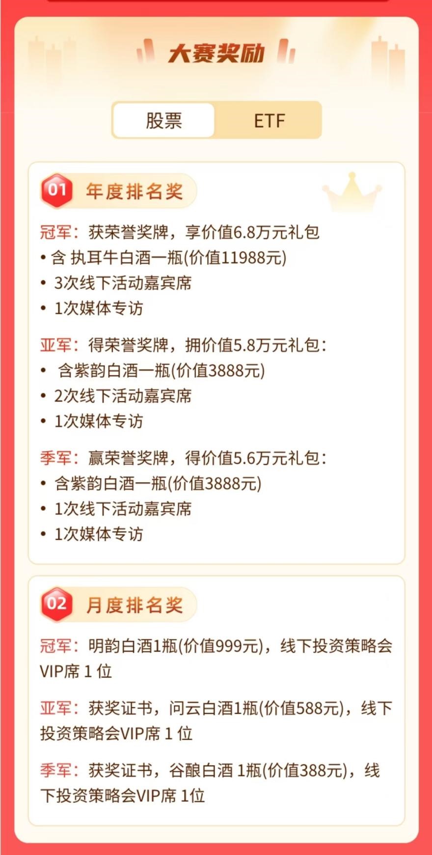 股票赛道:年度冠军将斩获价值6.8万元礼包,包含万元级白酒、媒体专访及大咖私享会席位;