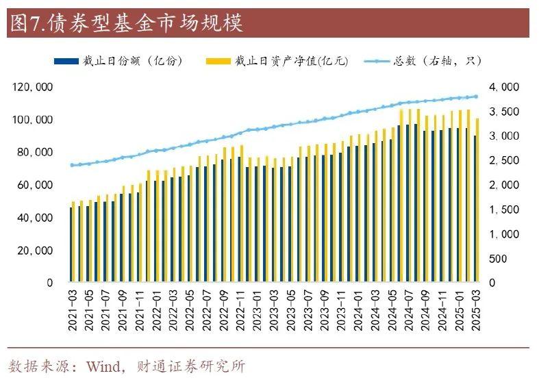 债券型基金方面,2025年一季度债基总份额9.03万亿份,较2024年四季度末下降4.63%;债券型基金资产净值约为10.05万亿元,较2024年四季度末下降4.58%。