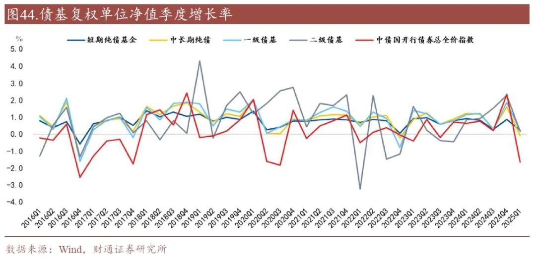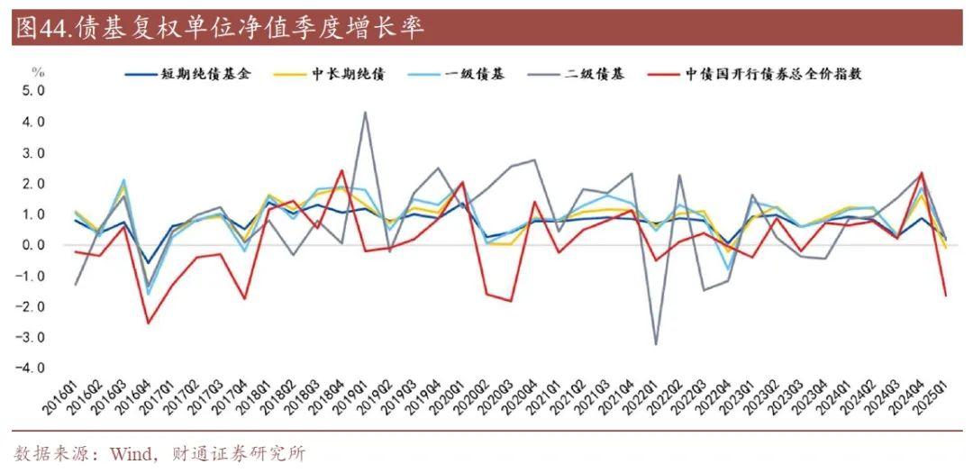 纯债型债基存续份额下降,混合型债基存续份额上升。2025年一季度,中长期纯债型基金、短期纯债型基金存续份额较2024年四季度分别减少2786亿份和1580亿份;混合债券型一级基金、混合债券型二级基金的存续份额较2024年四季度分别增加323亿份和785亿份。