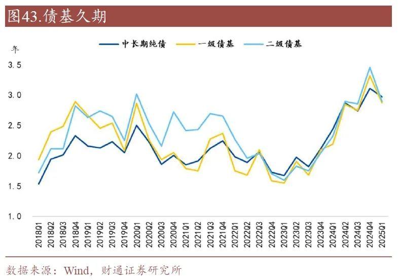 截至2025年一季度末,中长期纯债型基金、一级债基和二级债基的久期均回落。其中,中长期纯债型基金的久期(基金重仓债券组合久期,后同)为2.97年,较2024年四季度下降0.13年;一级债基的久期为2.87年,较2024年四季度下降0.11年;二级债基的久期为2.89年,较2024年四季度下行0.04年。
