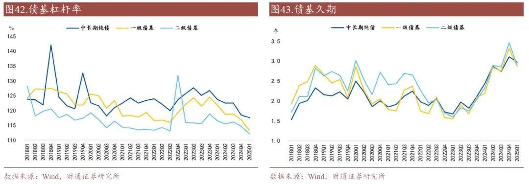 金融债、同业存单配置占比下降。债基持有的利率债、金融债、信用债、同业存单、其他债券的市值占债券投资市值占比分别为44.81%、19.70%、28.16%、2.80%、4.53%,环比分别变化0.41 pct、-0.02 pct、0.20 pct、-0.64 pct、0.04 pct。与2024年四季度相比,债基明显减少了对同业存单的配置比重。