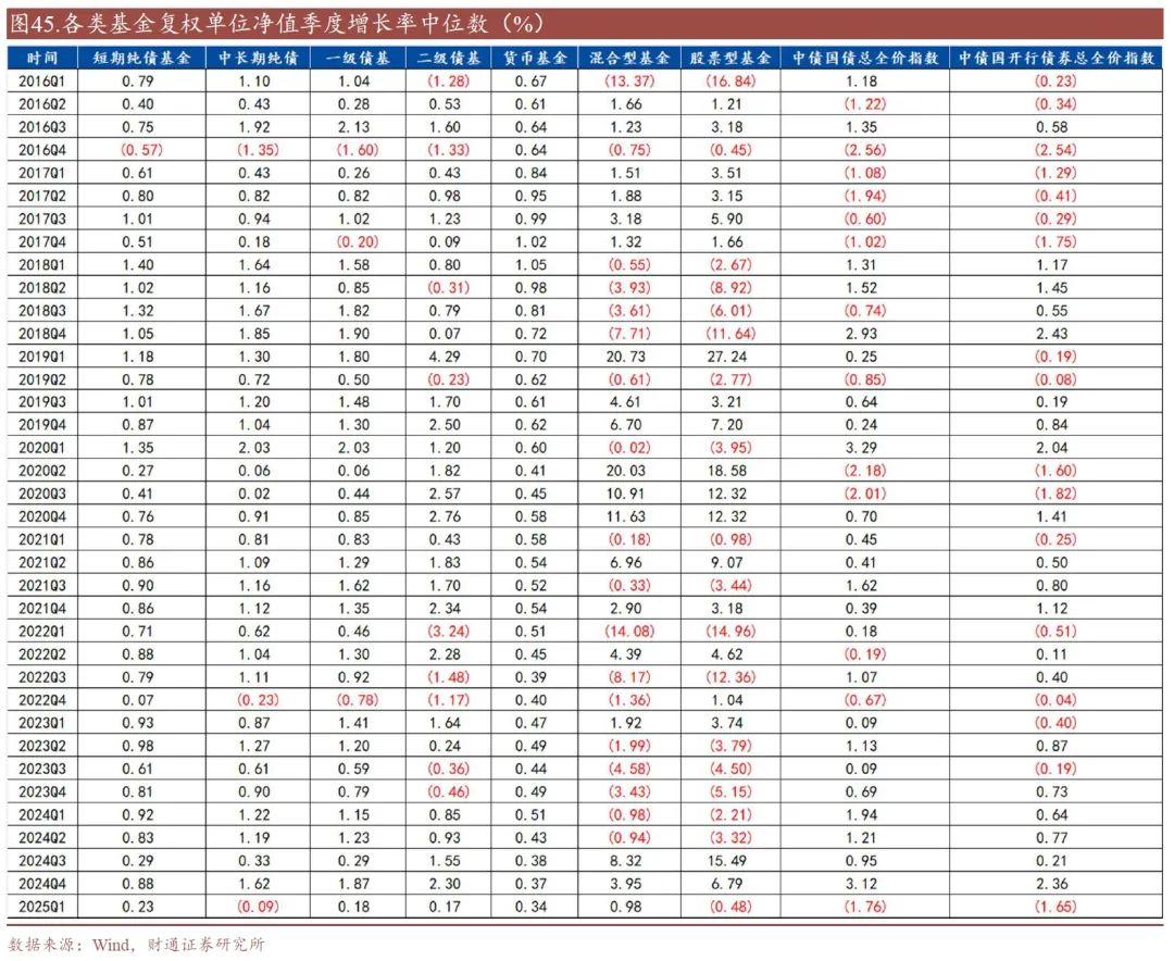 2025年一季度,各类基金的季度收益率中位数排序为: