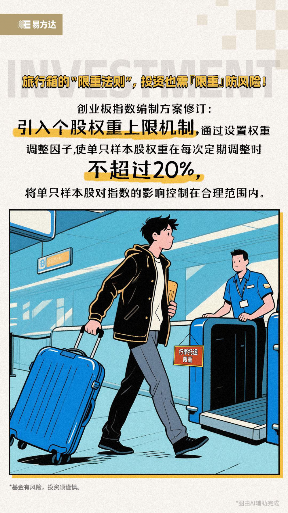 具体来看,作为A股市场重要标尺指数之一、中国创新创业企业的代表性指数,创业板指数此次修订后引入个股权重上限机制,如同旅行箱的“限重法则”——通过设置权重调整因子,使单只样本股权重在每次定期调整时不超过20%,将单只样本股对指数的影响控制在合理范围内,有助于避免单个企业股价大幅波动时造成指数如过山车般大起大落,可以更客观地反映板块整体走势。