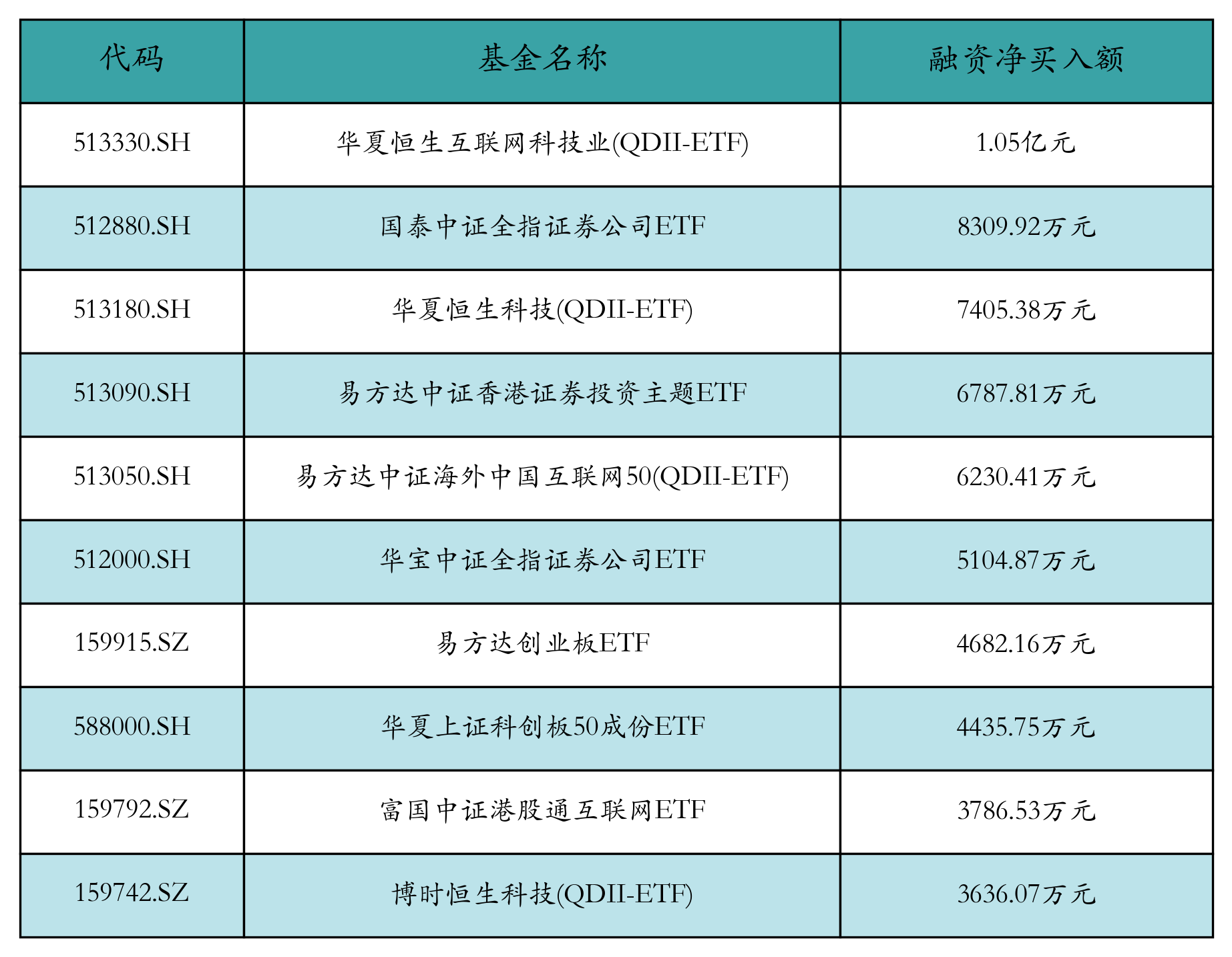 5月7日ETF融资净买入额前三位分别为:华夏恒生互联网科技业(QDII-ETF)(1.05亿元)、国泰中证全指证券公司ETF(8309.92万元)和华夏恒生科技(QDII-ETF)(7405.38万元),前10具体见下表:
