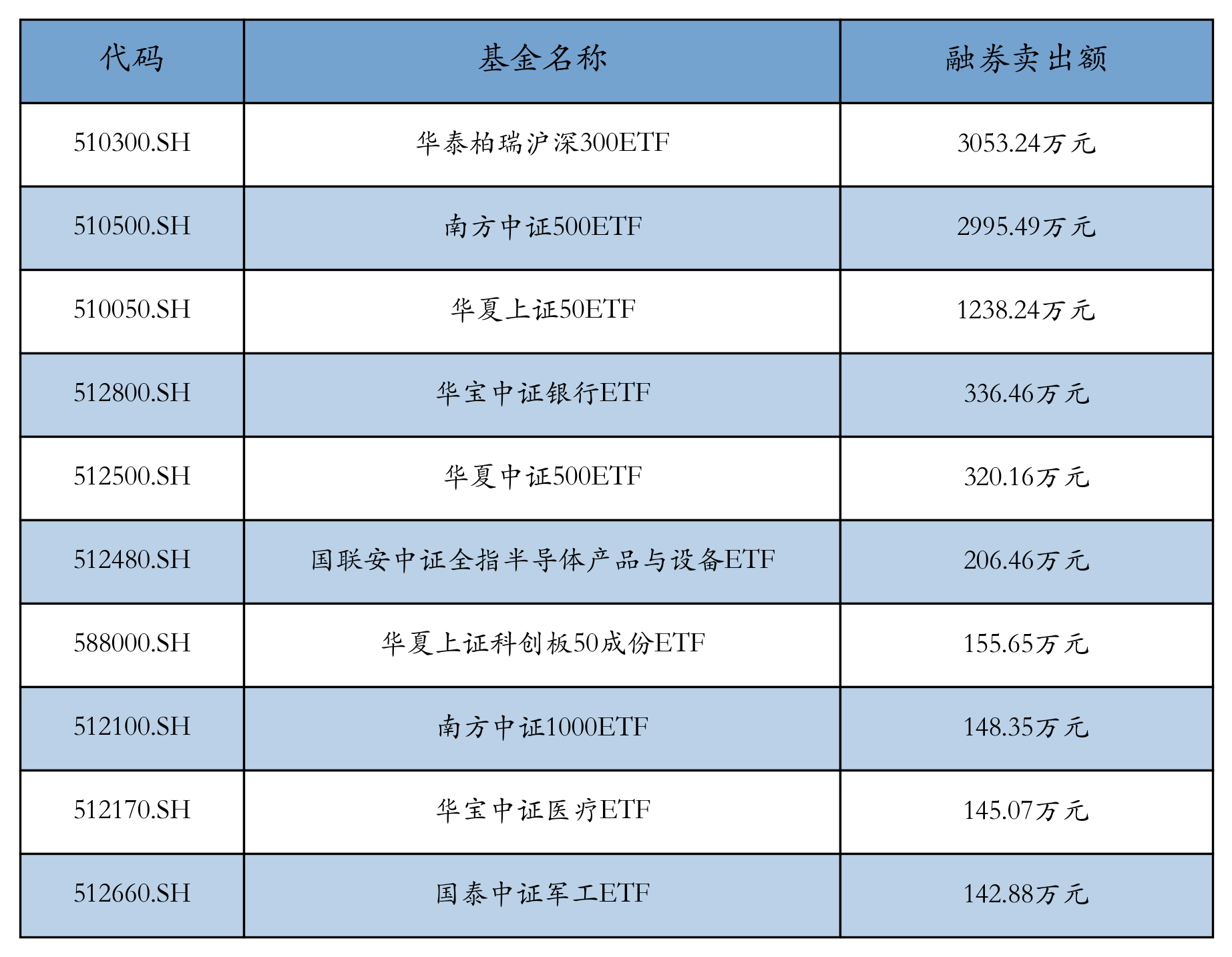 5月7日ETF融券卖出额前三位分别为:华泰柏瑞沪深300ETF(3053.24万元)、南方中证500ETF(2995.49万元)和华夏上证50ETF(1238.24万元),前10具体见下表:
