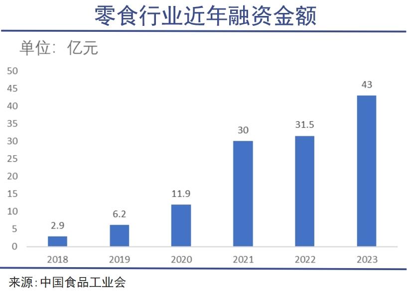 2020年,疫情催生的"宅经济"让资本开始涌入休闲食品赛道,当年行业融资事件达到49起,融资金额11.9亿元,两者同比增长均超过90%,一时间,零食成为消费板块里的香饽饽。