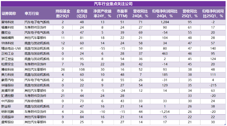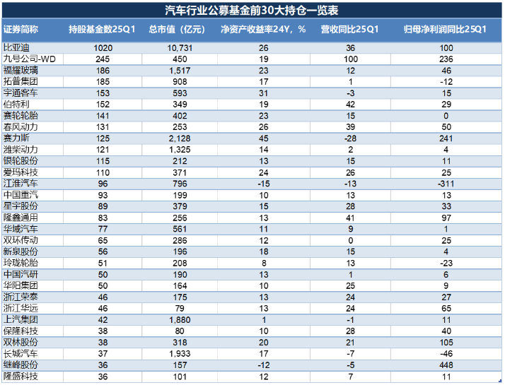 从1季度公募基金汽车行业持仓看,最多的有比亚迪、九号公司、福耀玻璃、拓普集团、宇通客车、伯特利、赛轮轮胎,都是些老面孔。