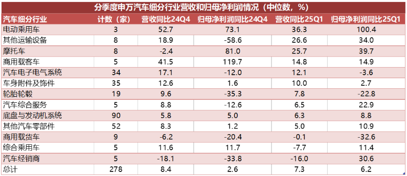 表现最好的细分行业是电动乘用车,1季度营收同比36%,归母净利润100%,其次是其他运输设备、摩托车,商用载客车。