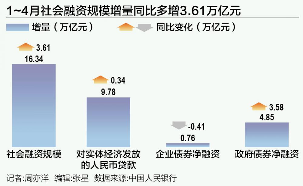 从增量看,2025年前四个月社会融资规模增量累计为16.34万亿元,比上年同期多3.61万亿元。其中,对实体经济发放的人民币贷款增加9.78万亿元,同比多增3397亿元;政府债券净融资4.85万亿元,同比多增3.58万亿元;企业债券净融资7591亿元,同比少4095亿元。4月当月,社会融资规模新增1.16万亿元。