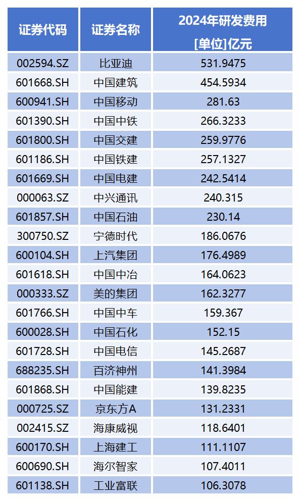同花顺数据显示,2024年,A股共计23家公司研发费用超过百亿,具体包括比亚迪、中国建筑、中国移动、中国中铁、中国交建、中国铁建、中国电建、中兴通讯、中国石油、宁德时代、上汽集团、中国中冶、美的集团、中国中车、中国石化、中国电信、百济神州、中国能建、京东方A、海康威视、上海建工、海尔智家、工业富联。