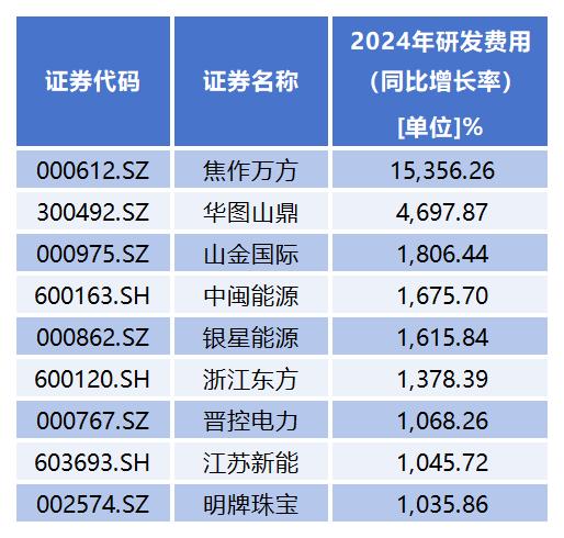 值得关注的是,2024年,A股共计9家公司研发费用同比增长超过1000%,具体包括焦作万方、华图山鼎、山金国际、中闽能源、银星能源、浙江东方、晋控电力、江苏新能、明牌珠宝。