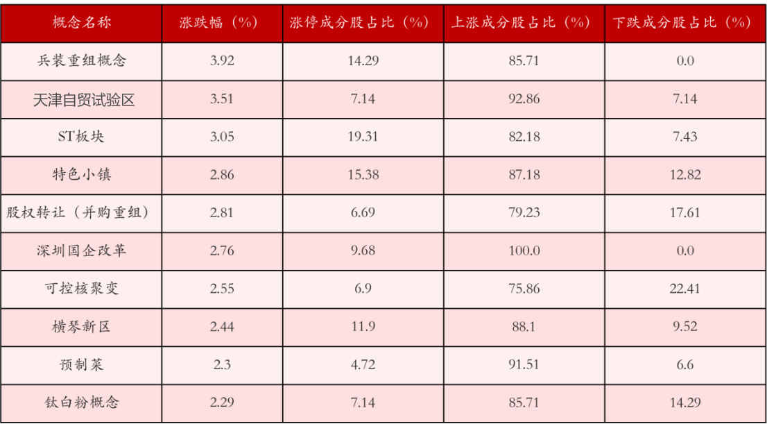 根据A股概念涨跌幅与所对应的股票池综合分析,涨幅靠前的三个概念板块分别为:兵装重组概念、天津自贸试验区与ST板块。排名前10位的概念板块相关数据见下表: