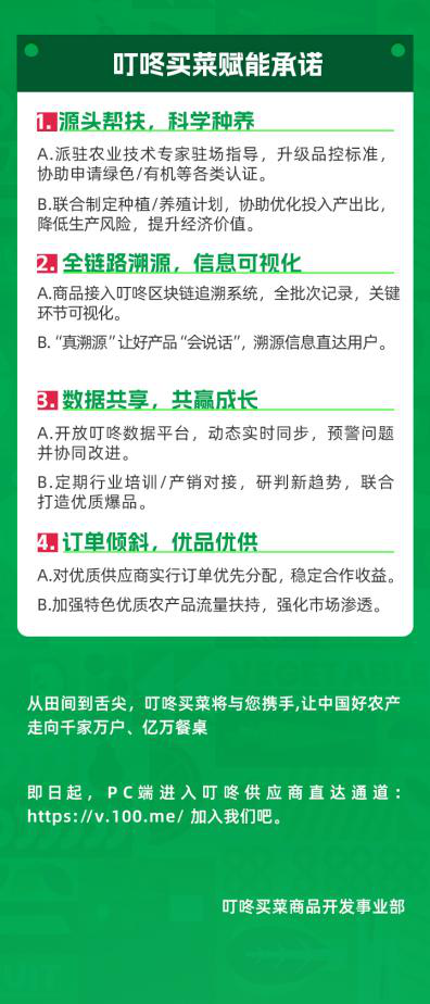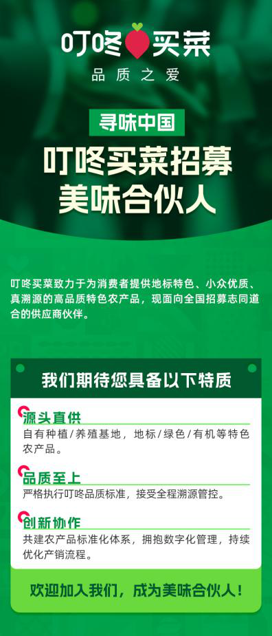 近期,为了更好地达成上述规划,叮咚买菜还广泛招募有能力且价值观一致的产地供应商,一起把真正的差异化好商品开发出来。