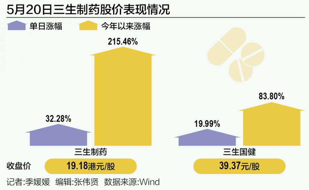 三生制药5月20日盘中股价大涨,截至当天收盘,报19.18港元/股,涨幅为32.28%。三生国健报39.37元/股,涨幅为19.99%。