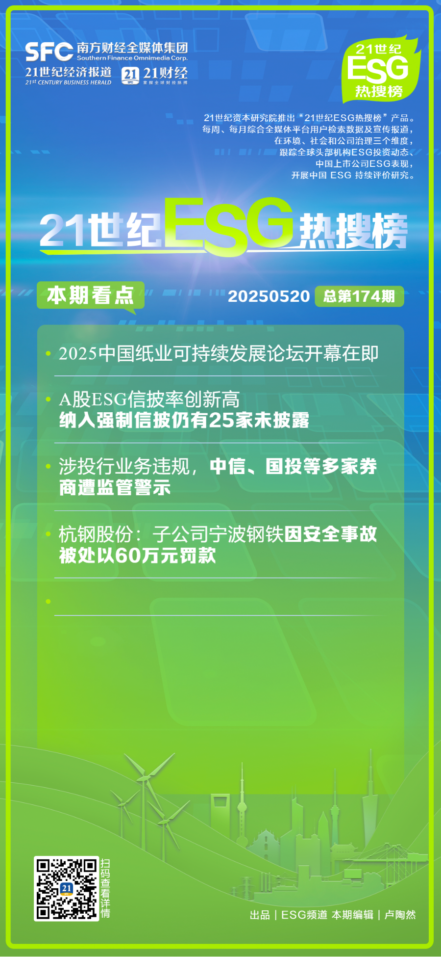 21世纪ESG热搜榜(第174期)丨A股ESG信披率创新高,纳入强制信披仍有25家未披露;2025中国纸业可持续发展论坛开幕在即