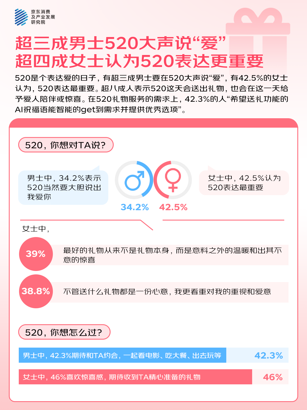 今年520,有超三成男士要大声说“爱”,有42.5%的女士认为,520表达最重要。超八成人表示520这天会送出礼物,也会在这一天给予爱人陪伴或惊喜。