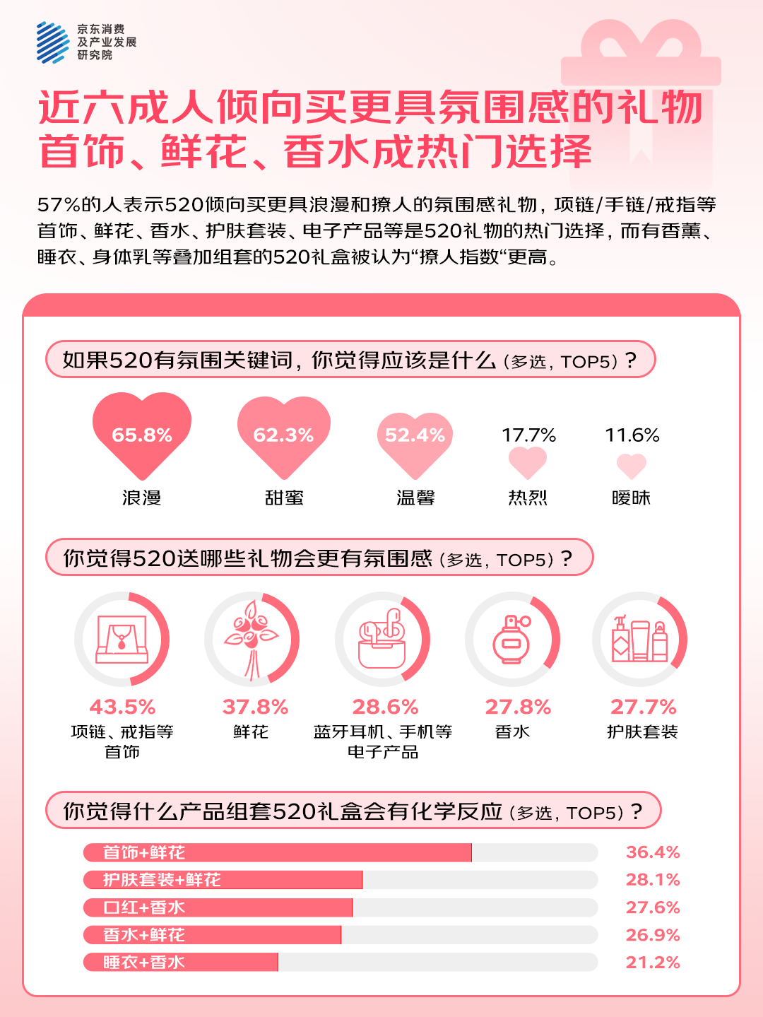 对520礼物的选择也能更直观的反映出年轻人的上述情感需求。在调研中,57%的消费者表示,520礼物要比平时的礼物更浪漫和撩人、更有氛围感,项链/手链/戒指等首饰、鲜花、香水、护肤套装、电子产品等是520礼物的热门选择。如果再将这些礼物进行适当的组合,更能激发出爱的化学反应,让浪漫氛围感buff叠满。其中,首饰+鲜花、护肤套装+鲜花、口红+香水、香水+鲜花、睡衣+香水等组套520礼物的“撩人指数”更高。
