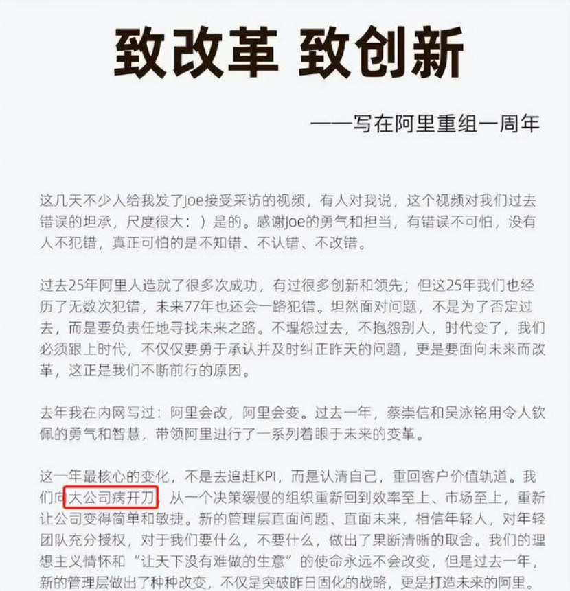 早在2023年阿里开启“1+6+N”组织变革时,阿里内网就出现了热帖《我们到底拆出了什么》,员工吐槽“拆网”将阿里切割成一个个不互通的模块,严重影响组织效率。更早之前,还有一个《致阿里》的热帖,吐槽阿里的管理制度、PUA文化,只搞形式主义。
