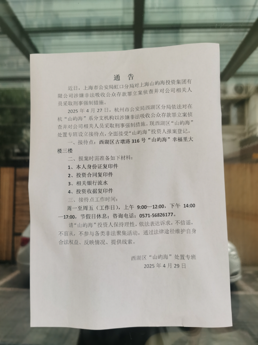 《通告》显示,近日,上海市公安局虹口分局对山屿海集团涉嫌非法吸收公众存款罪立案侦查并对公司相关人员采取刑事强制措施。2025年4月27日,杭州市公安局西湖区分局依法对在杭“山屿海”系分支机构以涉嫌非法吸收公众存款罪立案侦查并对公司相关人员采取刑事强制措施。