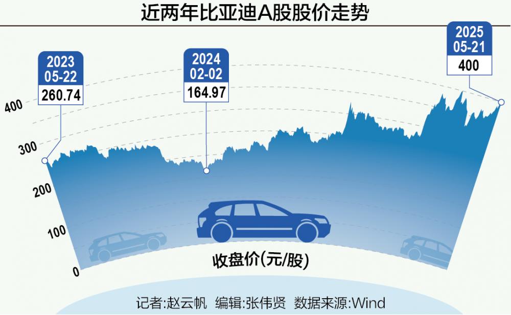 5月21日,比亚迪(002594.SZ)A股突破并收于“400元/股”大关,其盘中最高触及404.0元/股,时隔一个月后再次突破历史新高。