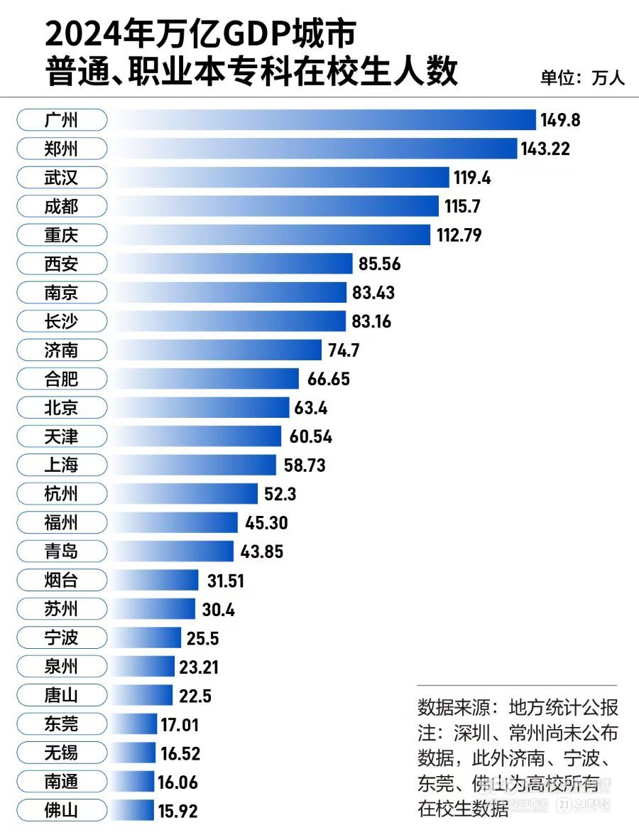 根据各地发布的2024年统计公报,27个万亿GDP城市中,25个城市公布了当年的高等教育相关数据,其中5个城市的普通(职业)本专科(除特殊标注之外,下同)在校生数量突破110万人,分别是广州、郑州、武汉、成都、重庆。